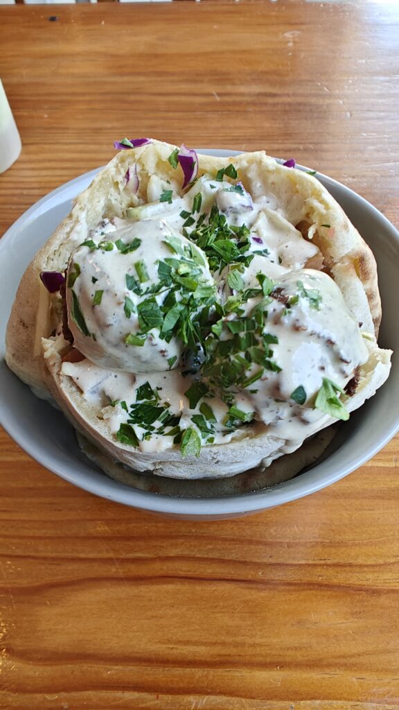 Un falafel buenazo que encontré en un restaurante de pésimo aspecto en Playa del Carmen, pero que resultó delicioso y baratísimo, además la mesera/cocinera/uniempleada estaba en tremenda platica por videollamada en una lengua que se llama Tzeltal, una cosa maravillosa.